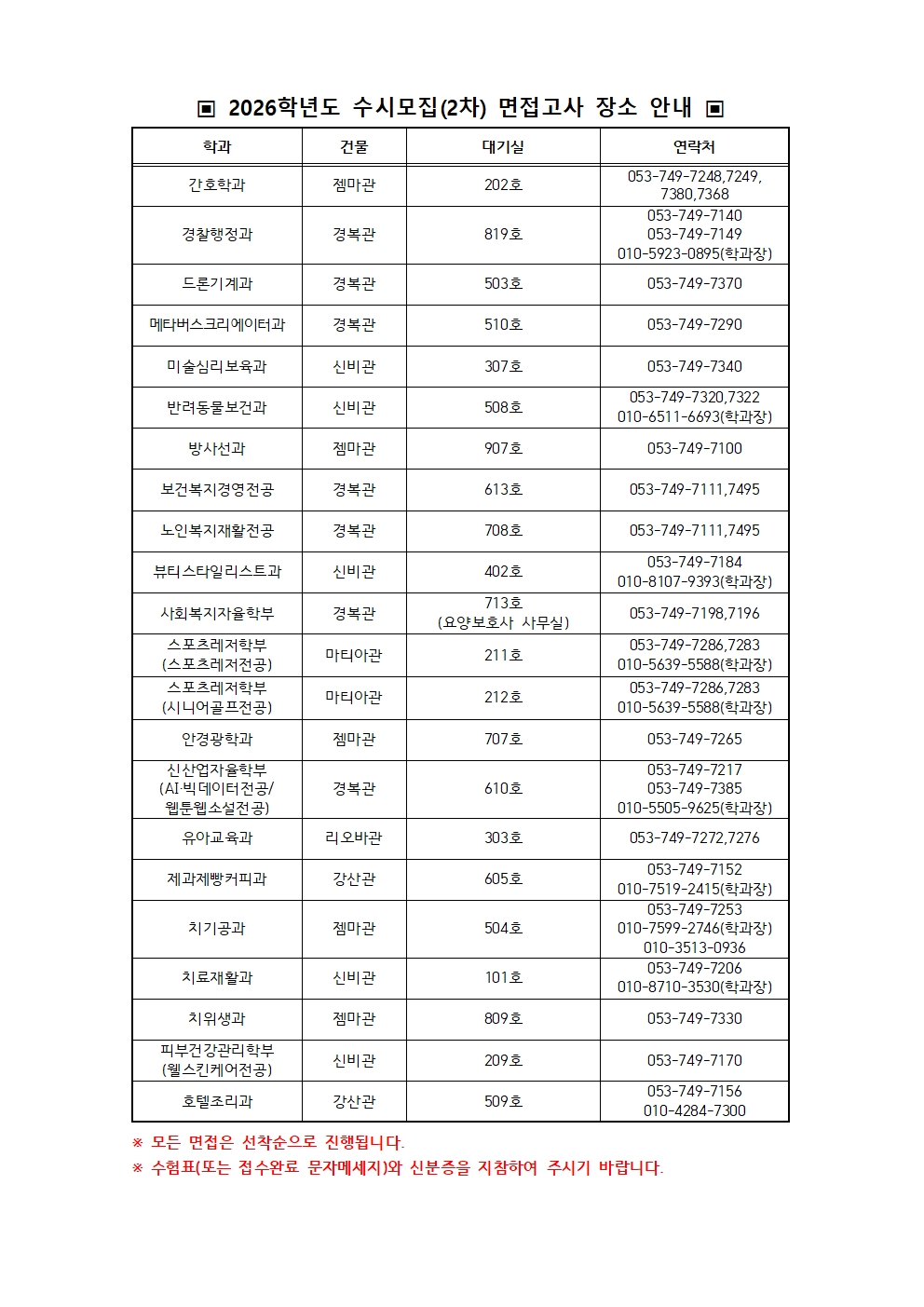 ○ 일자: 2025. 11. 22.(토) ○ 시간: 오전 09:00 ~ 오후 05:00 ○ 준비물: 수험표 또는 접수완료 문자메세지, 신분증 ○ 별도의 시간예약 없이 방문하여 도착한 순서대로 면접 진행 ※ 면접 당일 교내에 많은 차량이 몰려 도로 및 주차장이 매우 혼잡하오니 가급적 대중교통을 이용해주시기 바랍니다. ※ 면접관련 문의사항은 지원 학과로 문의주시기 바랍니다.